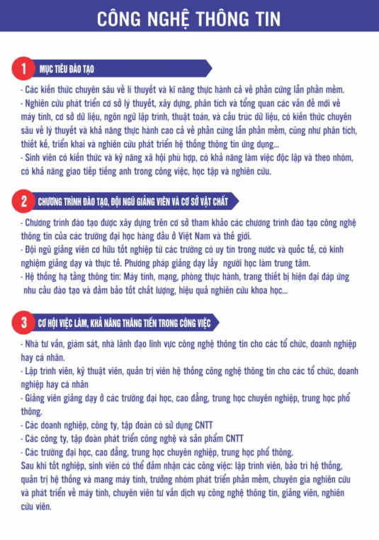 Nghề Công nghệ thông tin có thời gian đào tạo 2 năm với 79 tín chỉ tương đương với 1995 giờ, thời lượng thực hành chiếm trên 70% thời lượng toàn khoá học, bao gồm các nội dung chính (các môn chuyên môn chính); trang bị cho người học kiến thức chuyên môn và năng lực thực hành, có khả năng tham gia vào quá trình xây dựng phần mềm phục vụ cho các đơn vị, cá nhân cũng như các hệ thống thông tin; có kỹ năng làm việc độc lập hoặc làm việc theo nhóm; có khả năng sáng tạo, ứng dụng kỹ thuật, công nghệ vào công việc; có đạo đức lương tâm nghề nghiệp, có ý thức tổ chức kỷ luật, tác phong công nghiệp, có sức khoẻ, tạo điều kiện cho người học sau khi tốt nghiệp có khả năng làm việc hoặc tiếp tục học lên trình độ cao hơn, đáp ứng yêu cầu của sự nghiệp công nghiệp hoá, hiện đại hoá đất nước.