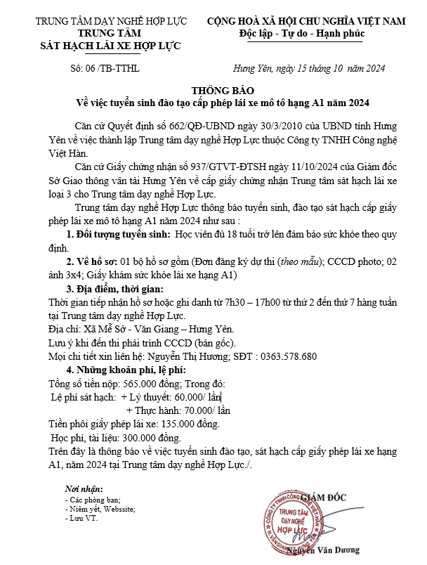 THÔNG BÁO VỀ VIỆC TUYỂN SINH ĐÀO TẠO CẤP PHÉP LÁI XE MÔ TÔ HẠNG A1 NĂM 2024