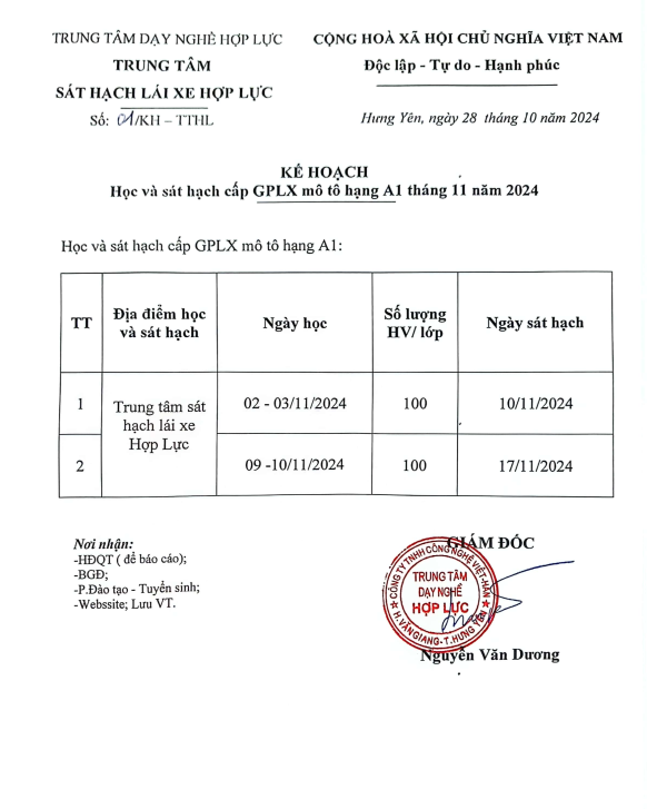 KẾ HOẠCH HỌC VÀ SÁT HẠCH CẤP GPLX MÔ TÔ HẠNG A1 - THÁNG 11 NĂM 2024