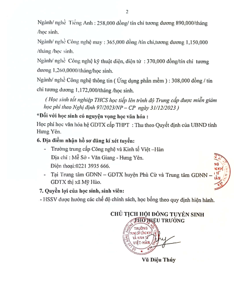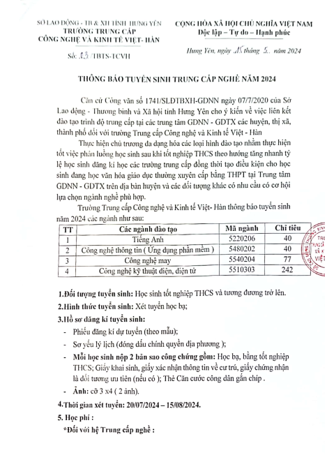 Thông báo tuyển sinh 2024 Trường Trung cấp Công nghệ và Kinh tế Việt Hàn