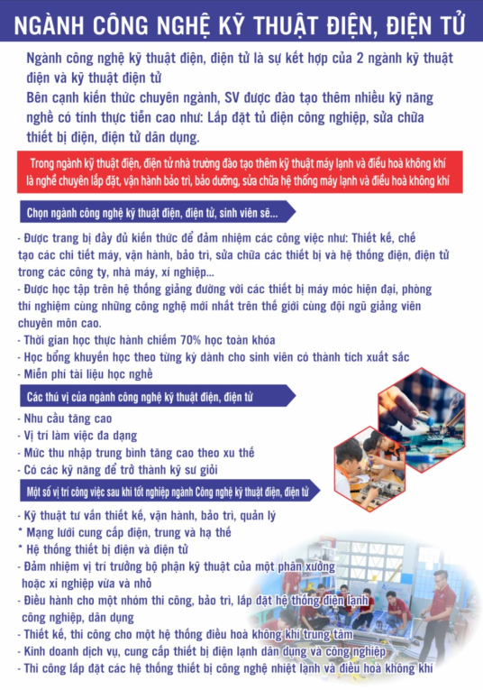 Ngành Công nghệ kỹ thuật Điện, điện tử  có thời gian đào tạo 2 năm. Khối lượng kiến thức toàn khóa học là 70 tín chỉ, tương đương với 2103 giờ, thời lượng thực hành chiếm trên 70% thời lượng toàn khoá học, bao gồm các nội dung chính (các môn chuyên môn chính : Thiết kế mạch in bằng máy tính, Chế tạo mạch in, hàn linh kiện; Điện tử nâng cao; Lạnh cơ bản; Hệ thống máy lạnh cơ bản và dân dụng; Kỹ thuật cảm biến; Kỹ thuật vi điều kiển; Kỹ thuật mạch điện tử….), trang bị cho người học kiến thức về An toàn điện; Tính chất của các loại vật liệu thường dùng trong lĩnh vực điện dân dụng; nguyên lý hoạt động của các mạch điện, của các thiết bị điện trong thiết kế, kiểm tra, sửa chữa; nguyên lý hoạt động, ứng dụng, của các mạch điện tử cơ bản, các mạch điện chuyên biệt đ­ược dùng trong thiết bị điện dân dụng.......