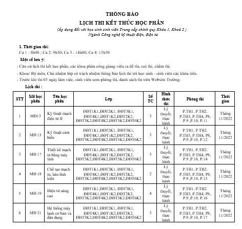LỊCH THI KẾT THÚC HỌC PHẦN
