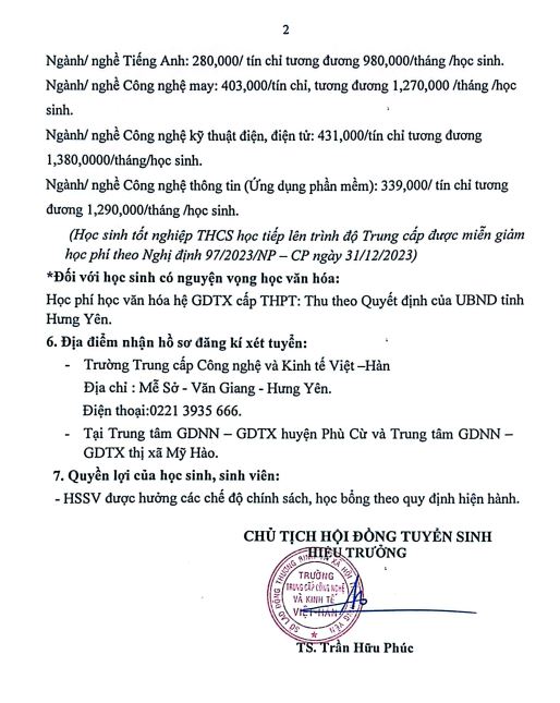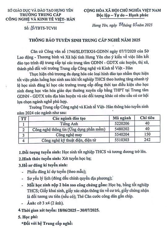 THÔNG BÁO TUYỂN SINH NĂM 2025 - TRƯỜNG TRUNG CẤP CÔNG NGHỆ VÀ KINH TẾ VIỆT - HÀN