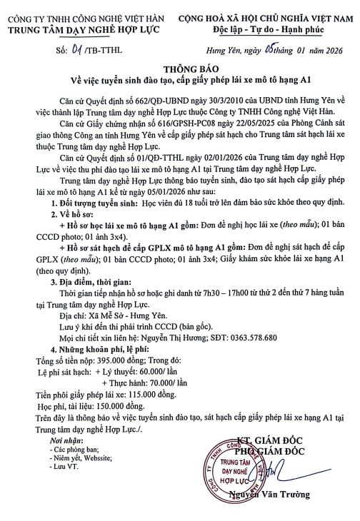 Thông báo tuyển sinh đào tạo, cấp giấy phép lái xe mô tô hạng A1 năm 2026