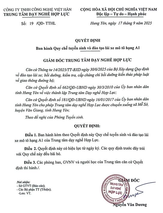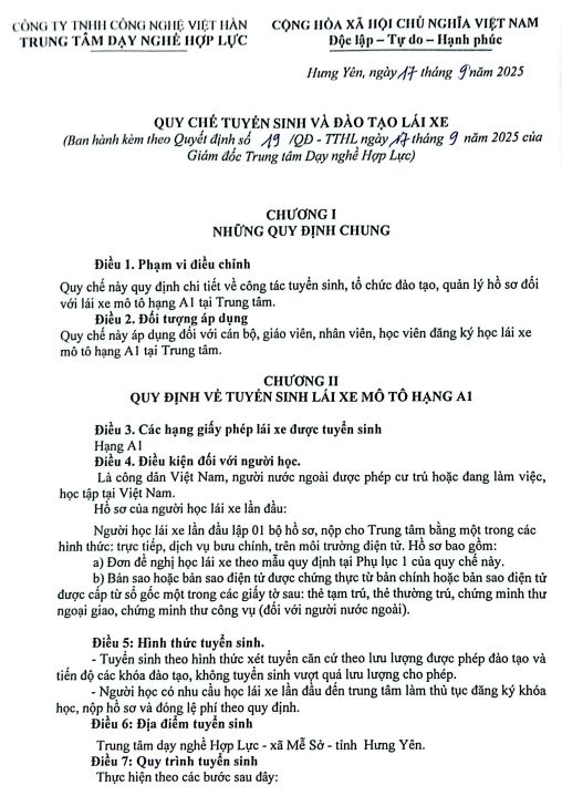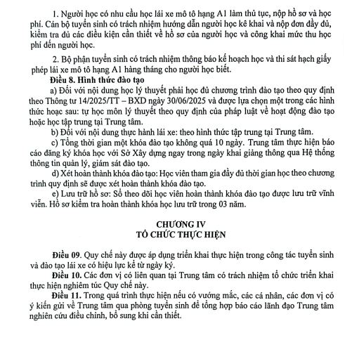Quyết định ban hành quy chế tuyển sinh và đào tạo lái xe mô tô hạng A1